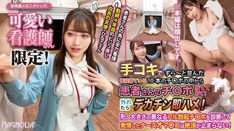 『心優しいナースがズラりと並んだチ○ポから手コキで担当患者のチ○ポ当てに挑戦!!』極上BODYナースが立ち並ぶ数多のチ○ポを触診検査…からの突然のデカチンぶっこみで「ダメ!ダメ!」連呼の本気絶頂中出し交尾!【街角素人モニタリング♯ひなこ♯24歳】